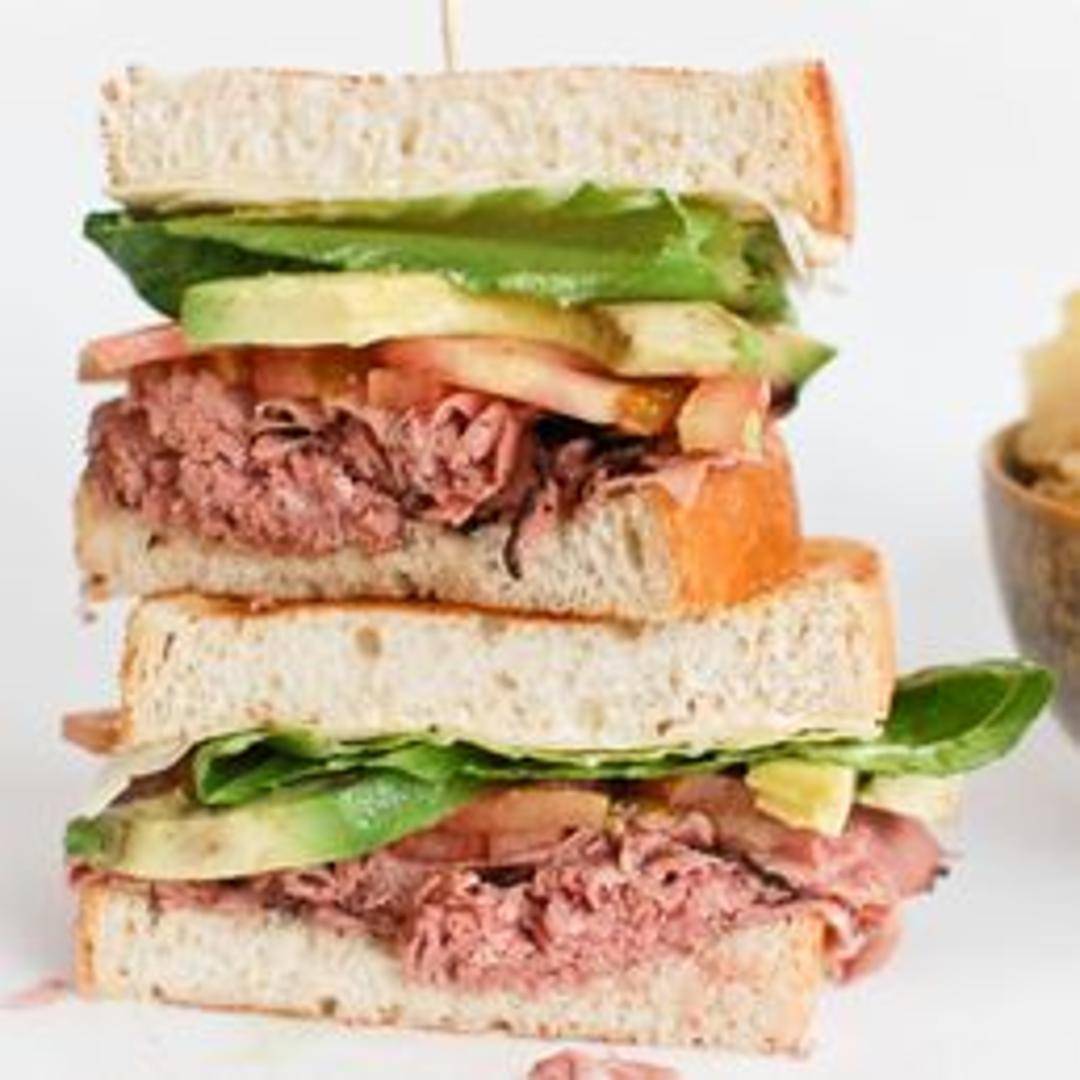 Roast beef with your choice of cheese, bread, vegetables, and condiments.
