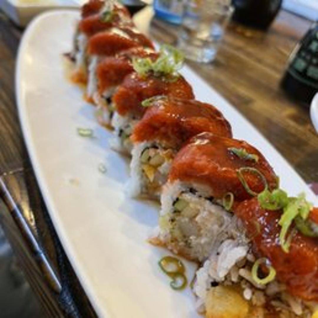 Spicy tuna and cucumber roll topped with seared tuna, jalapeño slices, sriracha, and a spicy mayo.