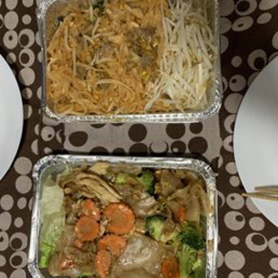 Rice noodles stir-fried with egg, bean sprouts, scallions, and basil, and your choice of protein (chicken, beef, pork, tofu, or shrimp) in a tangy and savory Pad Thai sauce, topped with crushed peanuts.