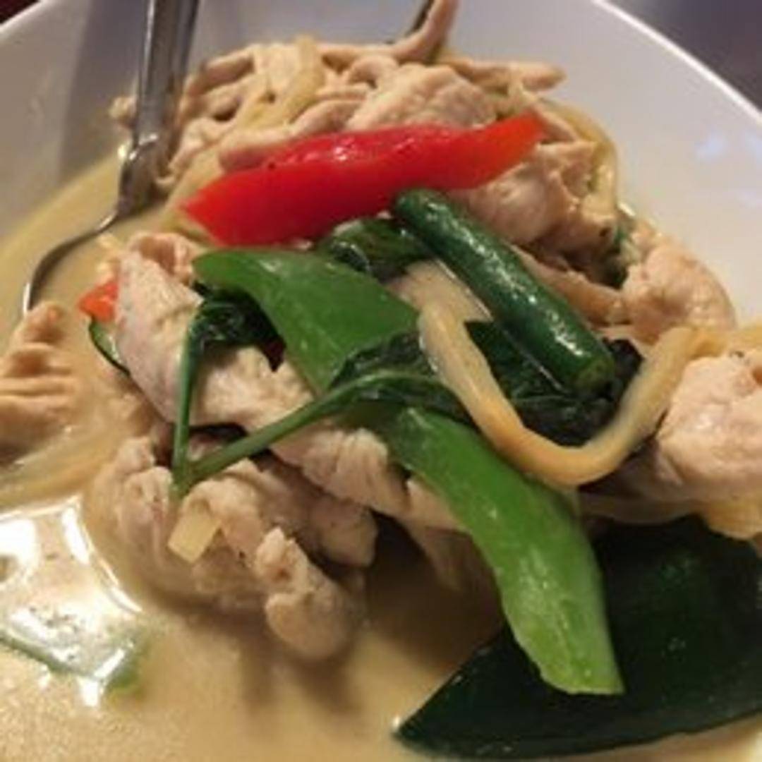 A fragrant and creamy green curry with coconut milk, bamboo shoots, bell peppers, basil, eggplant, and your choice of protein (chicken, beef, pork, tofu, or shrimp). Served with white rice.