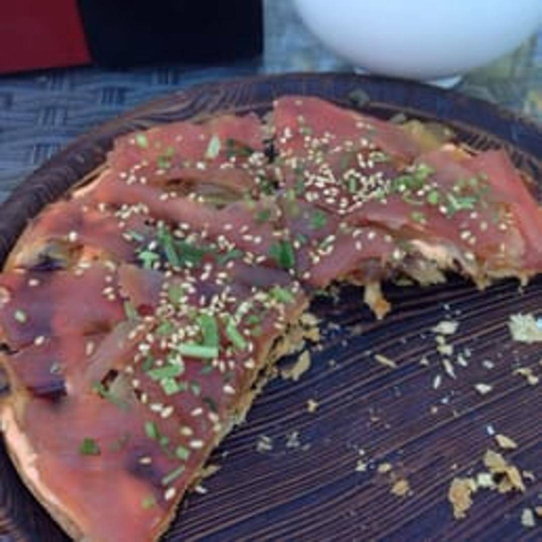 A unique appetizer featuring thinly sliced, high-quality Ahi tuna served atop a crispy wonton chip or flatbread base. Typically dressed with a complementary sauce such as avocado cream, spicy mayo, or a soy-based glaze, and often garnished with sesame seeds, seaweed salad, or microgreens.
