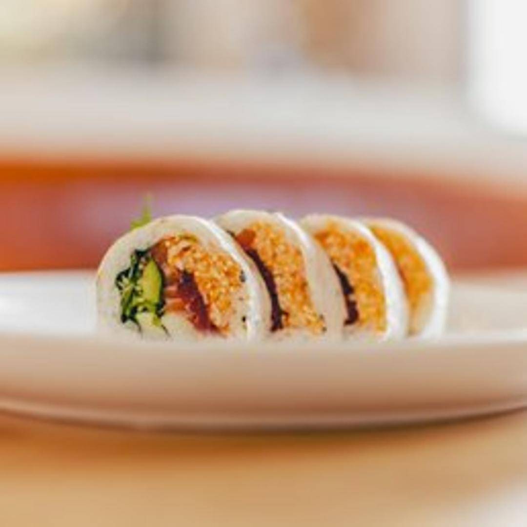 A California roll base topped with baked white fish, masago, green onions, and a special sauce.