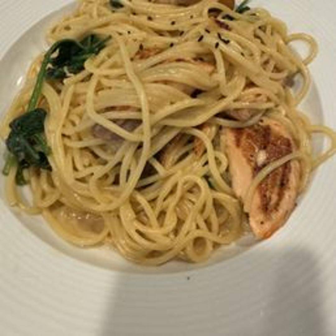 Pasta dish featuring grilled salmon with a savory miso-based sauce. Likely includes vegetables and a creamy texture.