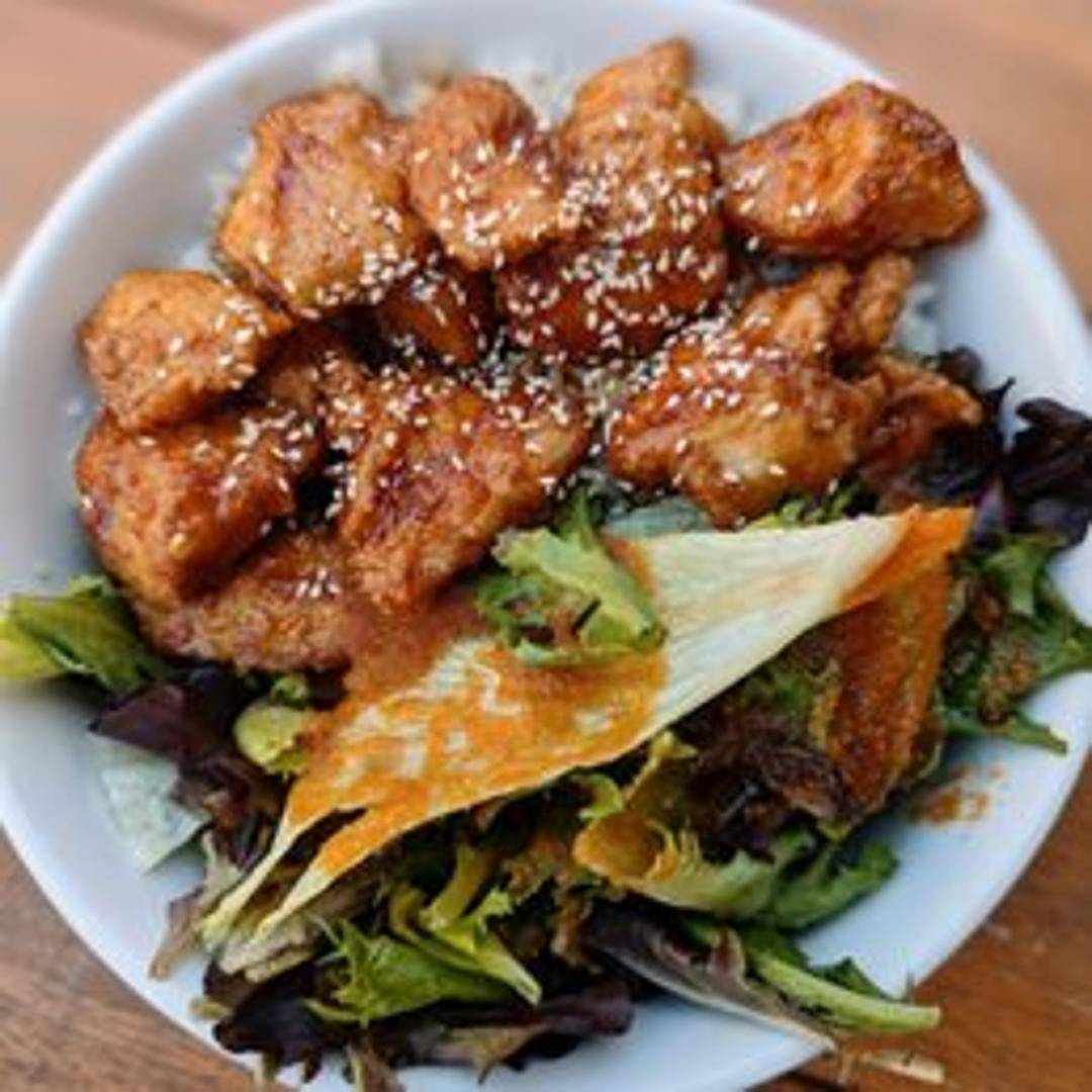 A flavorful bowl featuring grilled chicken, rice, and various toppings. Expect a combination of savory and potentially slightly sweet elements, likely including a sauce. Specific ingredients and toppings will vary, but anticipate a satisfying and balanced meal.