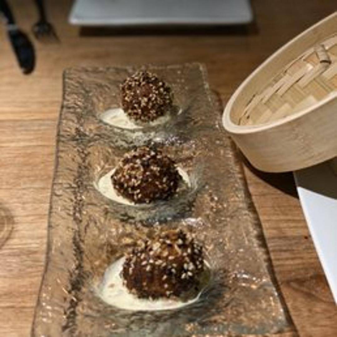 Delicate crab cakes seasoned with Singaporean spices, pan-fried to a golden brown.