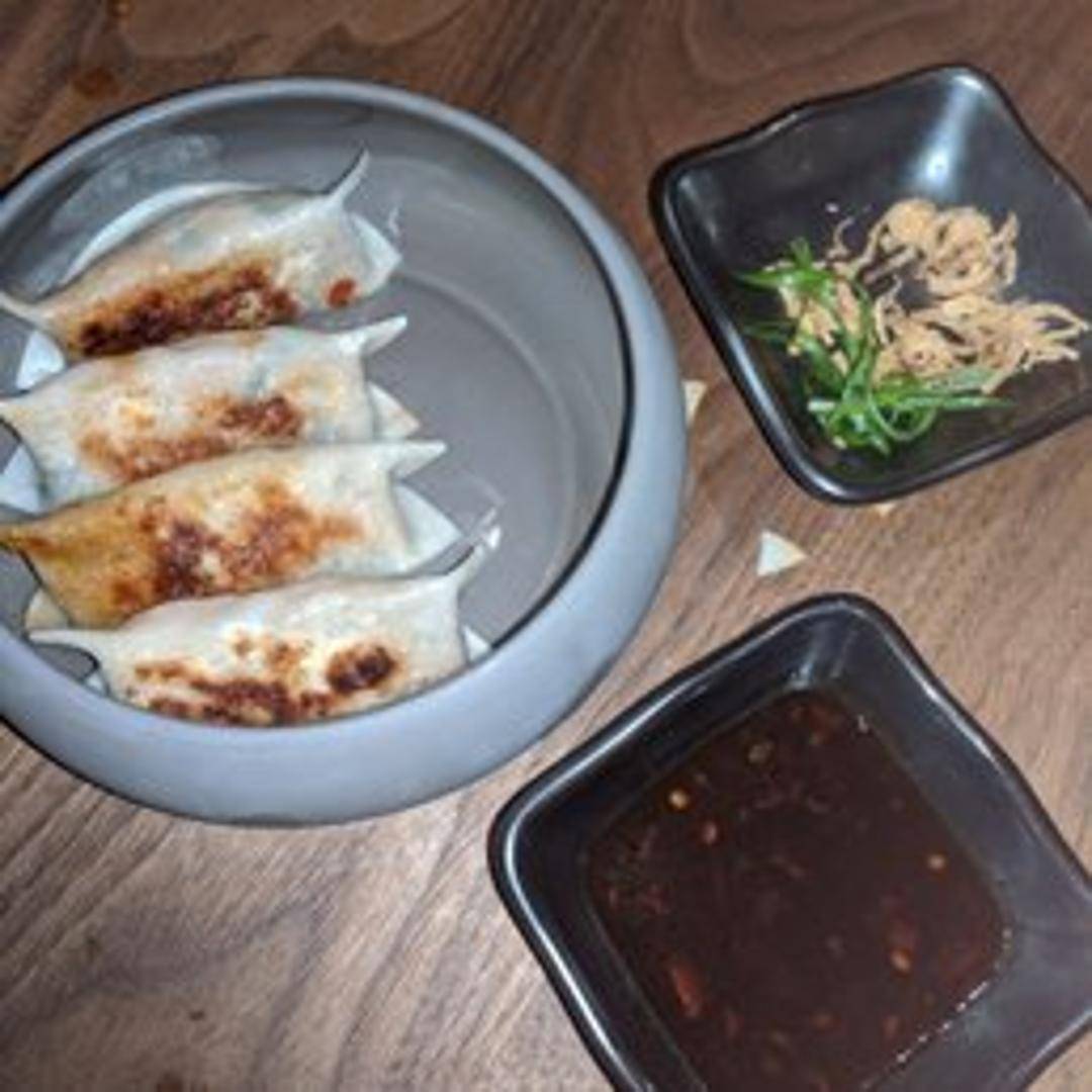 Pan-fried dumplings filled with seasoned ground meat and vegetables, typically served with a dipping sauce.