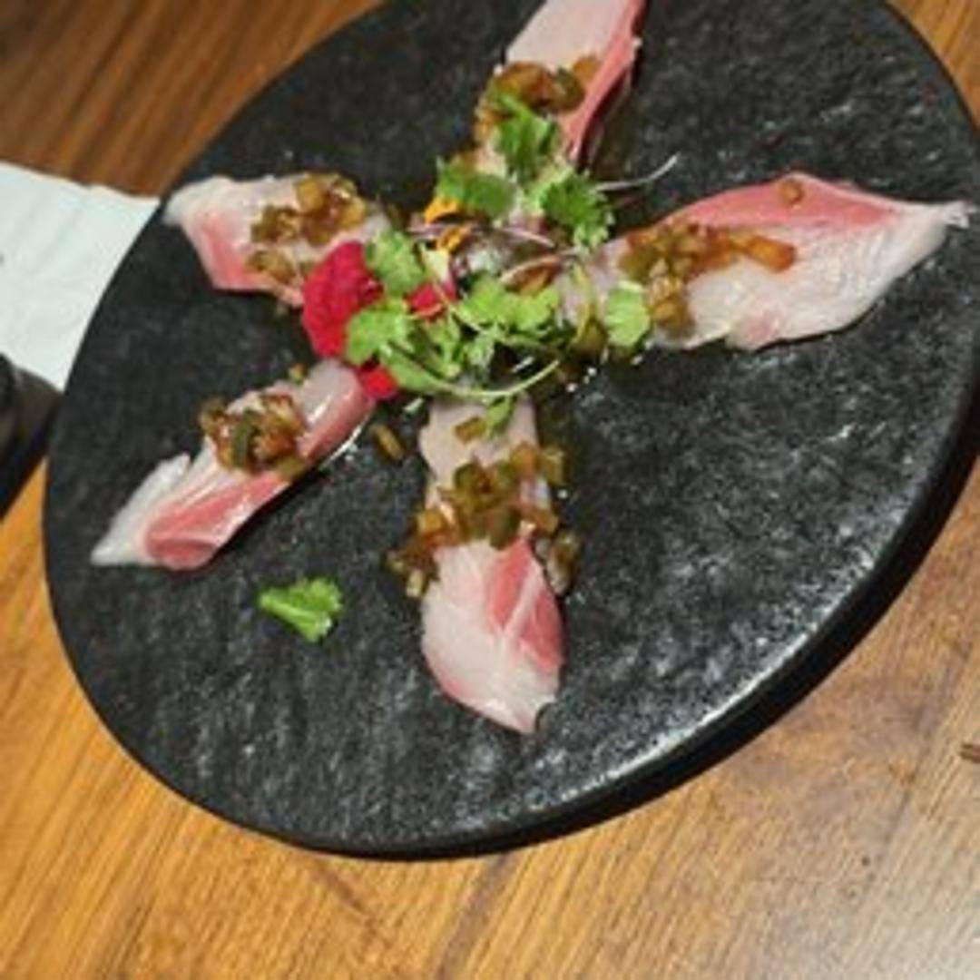 Spicy yellowtail, cucumber inside, topped with yellowtail, avocado, jalapeño, and ponzu sauce.