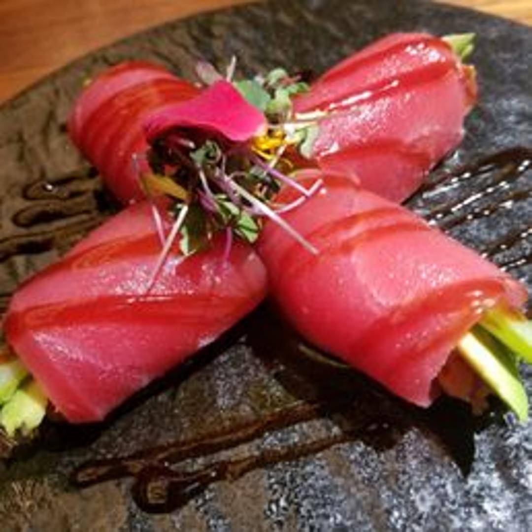 Spicy tuna, shrimp tempura, avocado, cucumber wrapped with soy paper, topped with mango salsa.