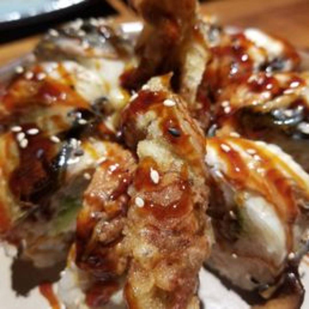 Soft shell crab, cucumber, gobo, avocado, sprouts, masago with eel sauce.