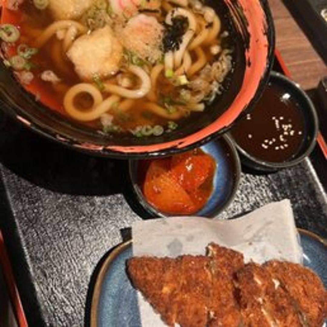 A comforting Japanese noodle soup featuring thick, chewy udon noodles in a savory broth. Often includes ingredients such as scallions, tempura flakes (tenkasu), fish cake (narutomaki), and seaweed. May also contain protein such as chicken, beef, or tofu.