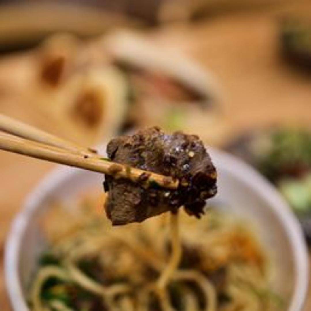 Silky Yunnan rice noodles served in a fragrant, hearty broth, generously topped with succulent pieces of slow-braised beef. The beef is tender and rich, having absorbed the deep flavors of a meticulously prepared savory sauce, creating a satisfying and robust noodle experience.