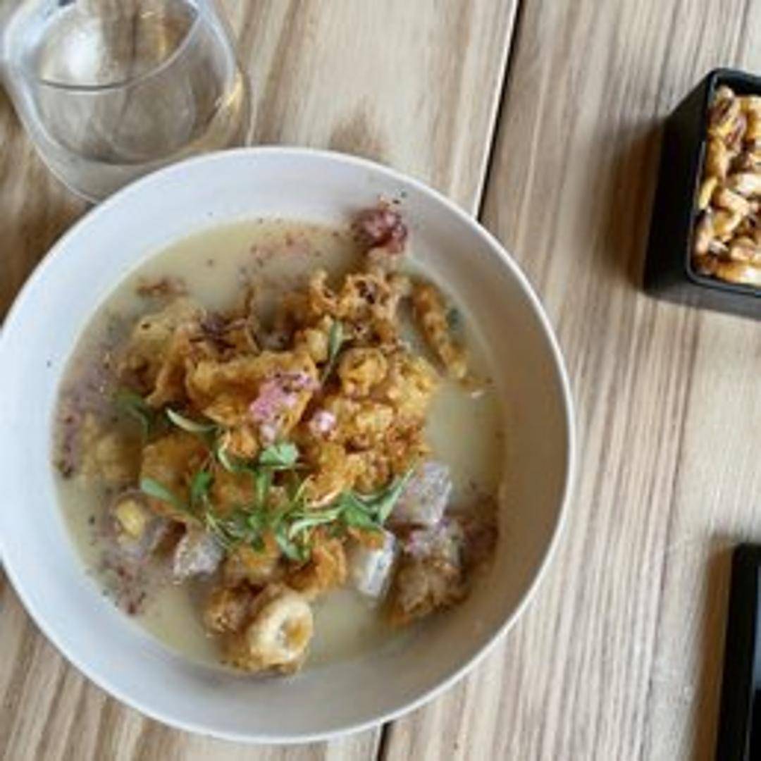 Experience the quintessential Peruvian-Japanese fusion with this vibrant Leche De Tigre Ceviche. Featuring exquisitely fresh, succulent pieces of white fish, delicately cured in the invigorating 'Leche de Tigre' – a zesty, nuanced marinade crafted from freshly squeezed lime juice, fragrant Peruvian Aji Amarillo chili, red onion, cilantro, and a whisper of ginger. This harmonious blend offers a refreshing burst of citrus, a subtle spicy kick, and a deep umami richness. Traditionally served with tender sweet potato, plump choclo (Peruvian corn), and crispy cancha (toasted corn), providing a delightful contrast in textures and flavors.