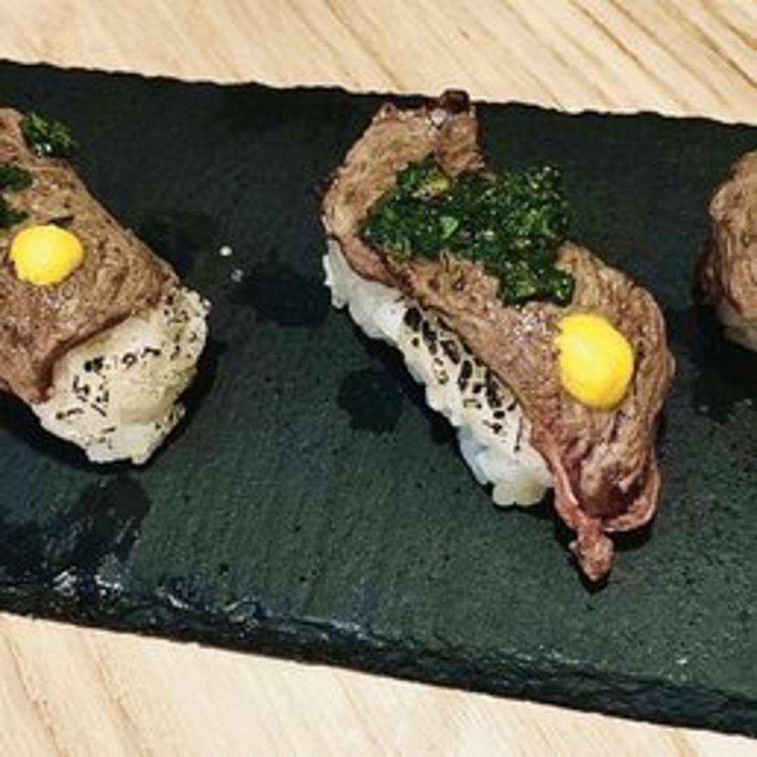 A sophisticated Nikkei interpretation of classic nigiri, featuring thinly sliced, perfectly seared beef draped over a delicate bed of seasoned sushi rice. Enhanced with a hint of gourmet sauce or a sprinkle of fresh herbs, this dish offers a succulent and tender bite with a rich umami flavor profile.