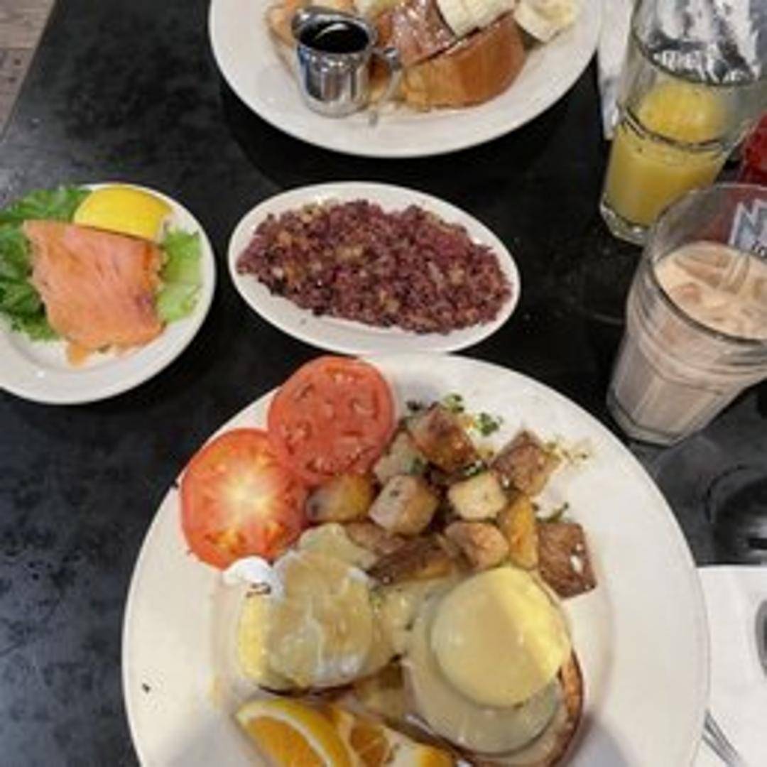 Two poached eggs nestled on top of toasted English muffins with Canadian bacon, smothered in a rich and creamy hollandaise sauce. A decadent and satisfying classic.