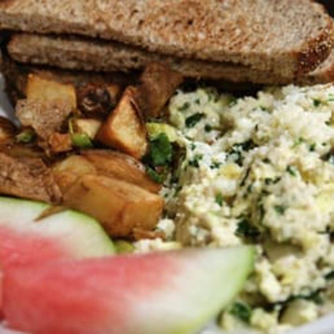 Scrambled eggs with ground beef, spinach, onions, and mushrooms, seasoned with garlic and herbs.