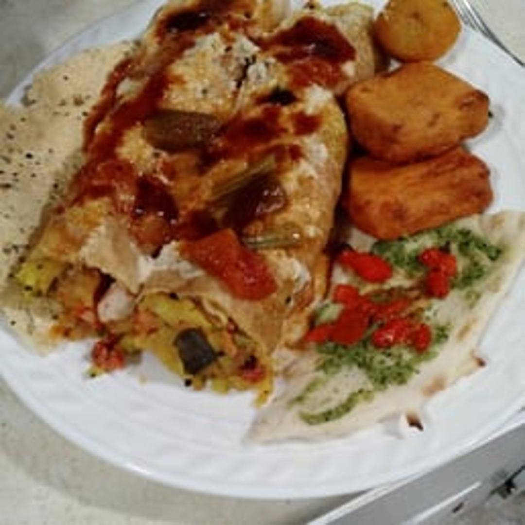 A South Indian crispy crepe (dosa) filled with a delicious and spiced chicken masala. Served with sambar (lentil-based vegetable stew) and coconut chutney for a complete and satisfying meal.