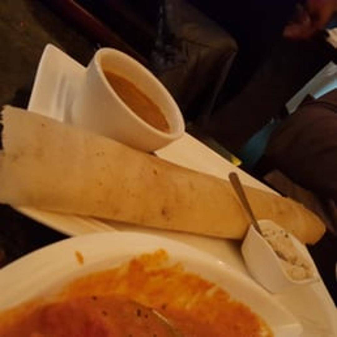 A thin and crispy South Indian crepe made from fermented rice and lentil batter, filled with a flavorful mixture of spiced potatoes, onions, and mustard seeds. Served with sambar (lentil-based vegetable stew) and coconut chutney.