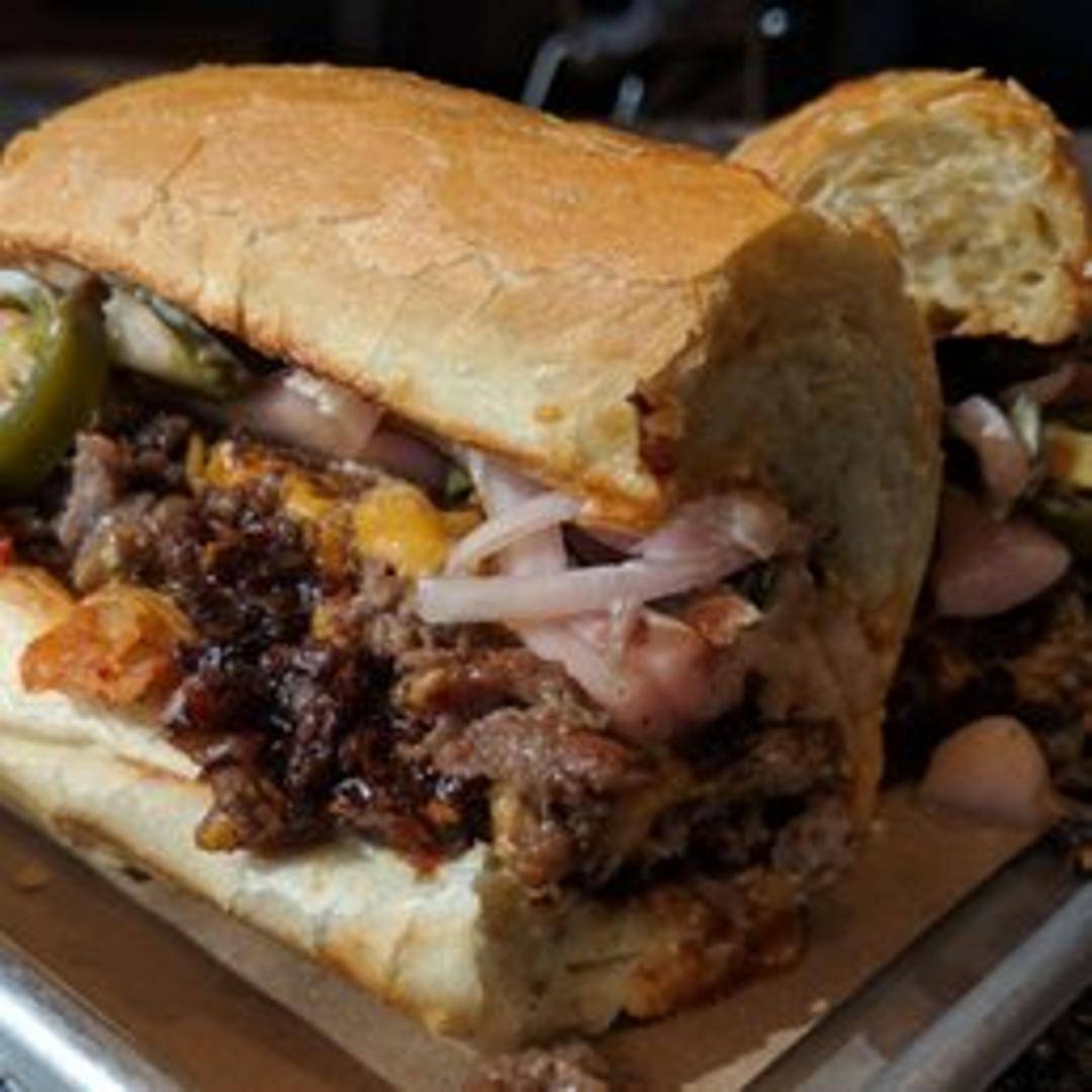 Thinly sliced steak grilled with onions and peppers, topped with melted cheese on a toasted hoagie roll.