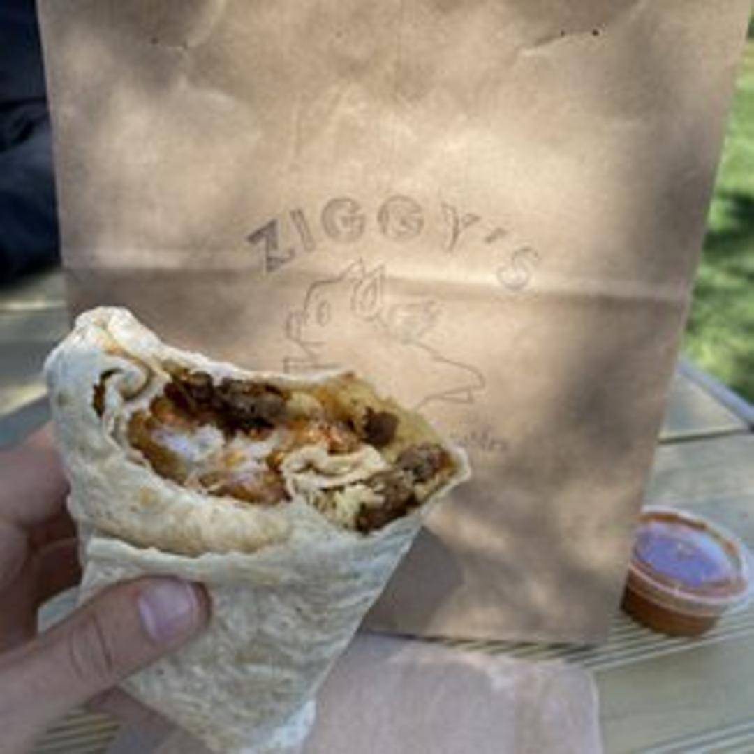 A large flour tortilla filled with scrambled eggs, your choice of bacon, sausage, or chorizo, crispy potatoes, melted cheese, and a drizzle of house-made salsa.