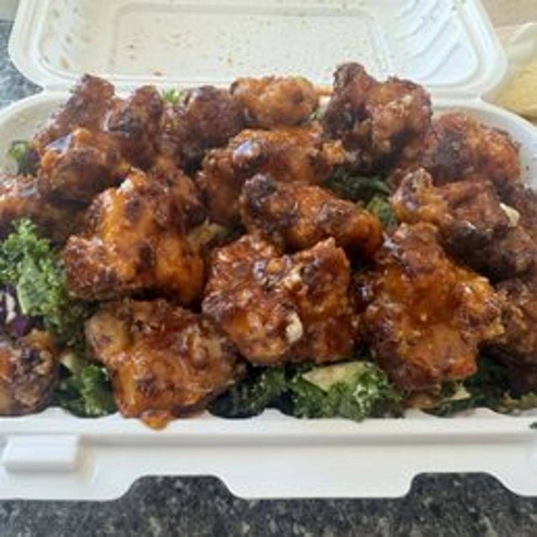 A vibrant salad featuring mixed greens, grilled chicken, roasted corn, black beans, avocado, tomatoes, red onion, and a zesty cilantro-lime vinaigrette. Garnished with crispy tortilla strips.