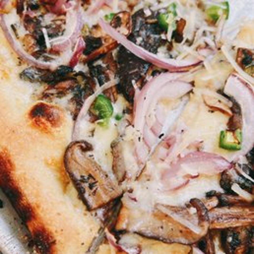 Thin-crust pizza topped with a blend of sautéed mushrooms, garlic, herbs, and a creamy cheese sauce. May contain seasonal mushrooms.