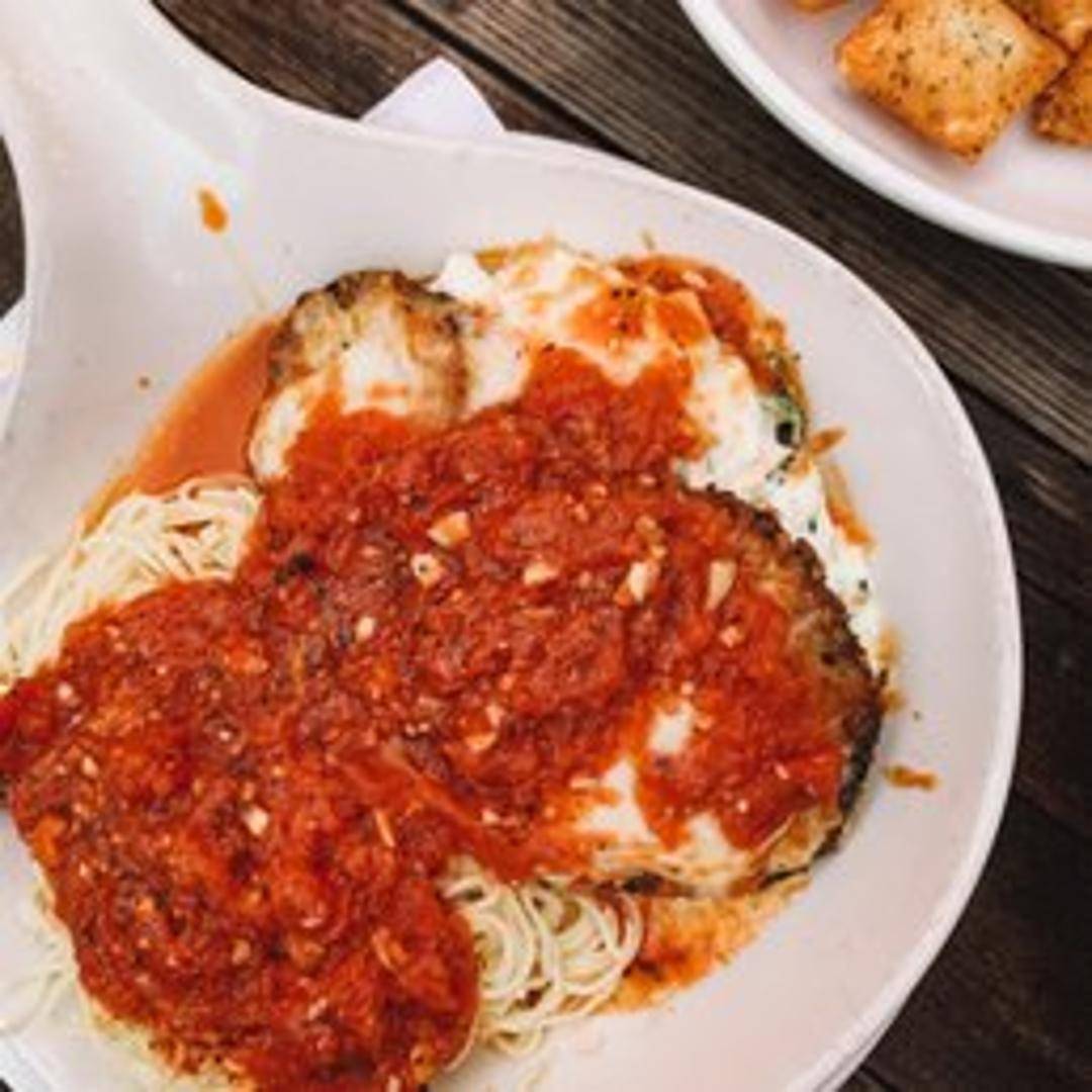 Experience a comforting twist on a traditional favorite with our Stuffed Eggplant Parm. Tender slices of fresh eggplant are expertly prepared and then generously stuffed with a creamy blend of ricotta cheese, aromatic herbs, and savory seasonings. Each stuffed eggplant is baked until golden, smothered in our robust house-made marinara sauce, and topped with melted, bubbly mozzarella cheese. A hearty and satisfying vegetarian delight.