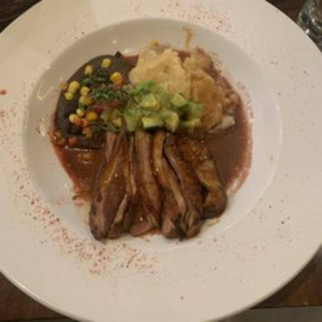 Duck breast grilled to perfection, featuring a crispy skin and a succulent, flavorful interior. Served with a complementary sauce and seasonal accompaniments that highlight the duck's richness.