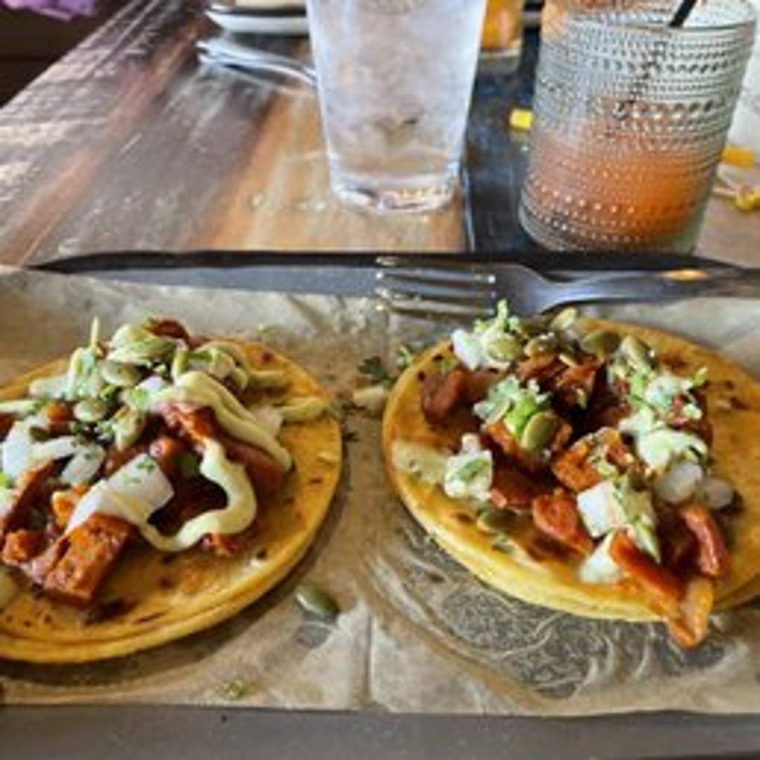 Roasted sweet potato marinated in al pastor spices, served on warm corn tortillas, topped with pineapple salsa, onions, and cilantro.