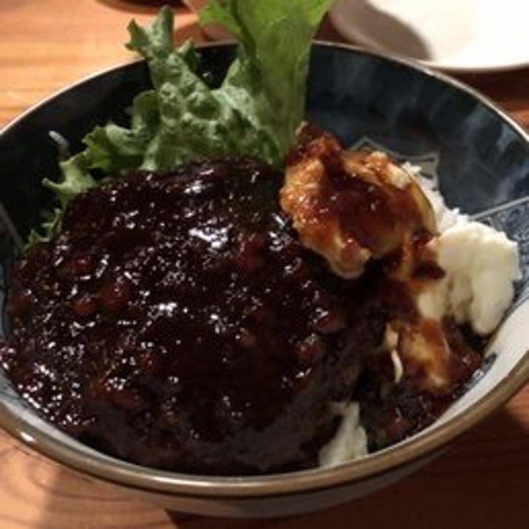 A classic Hawaiian comfort food served as a hearty donburi (rice bowl). This satisfying dish features a bed of fluffy white rice topped with a succulent grilled hamburger patty, a perfectly fried egg with a runny yolk, and generously smothered in a rich, savory brown gravy, creating a wonderfully fulfilling and flavorful meal.