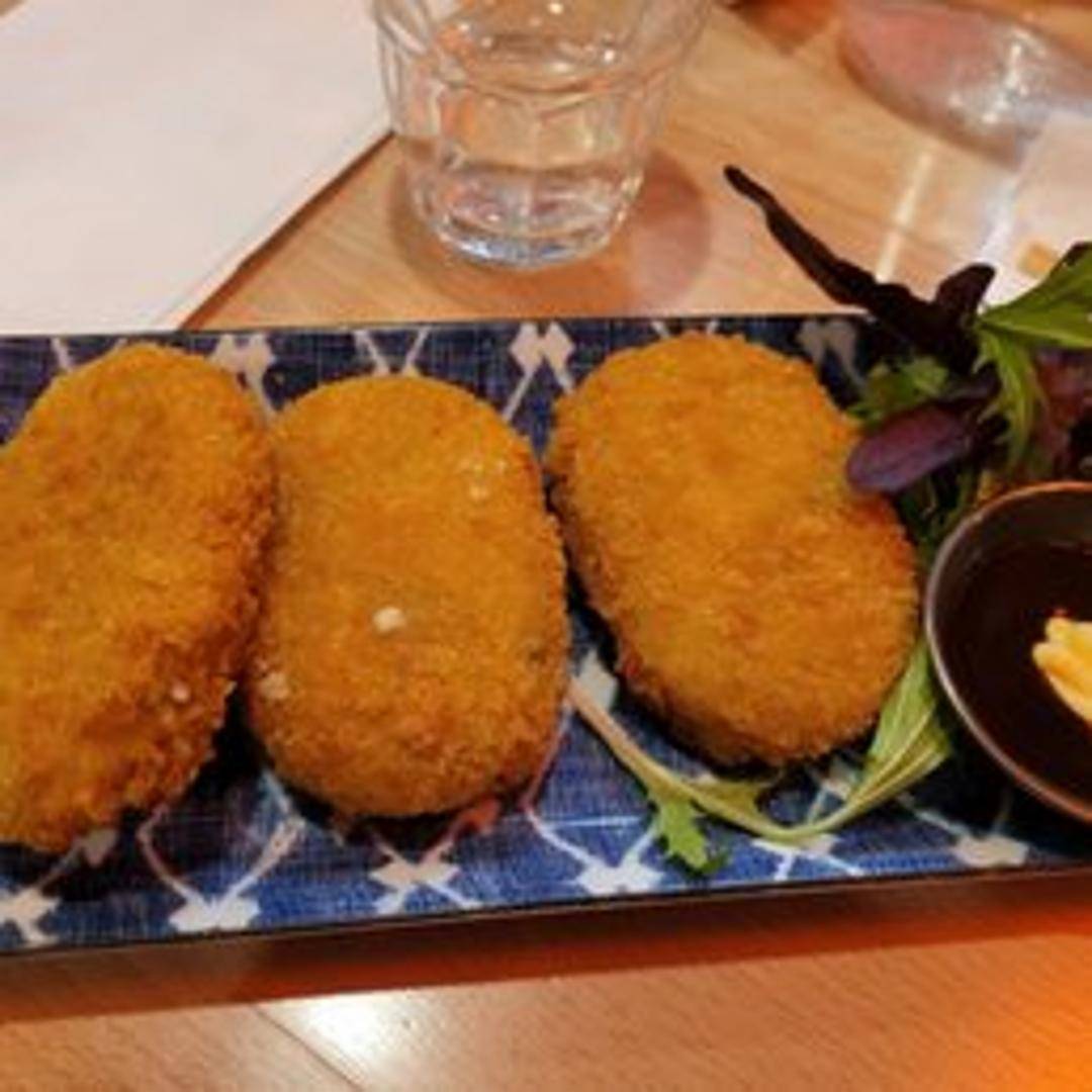 Crispy Japanese potato croquettes filled with a savory mix of vegetables, deep-fried to a golden brown. Served with a side of tonkatsu sauce for dipping.