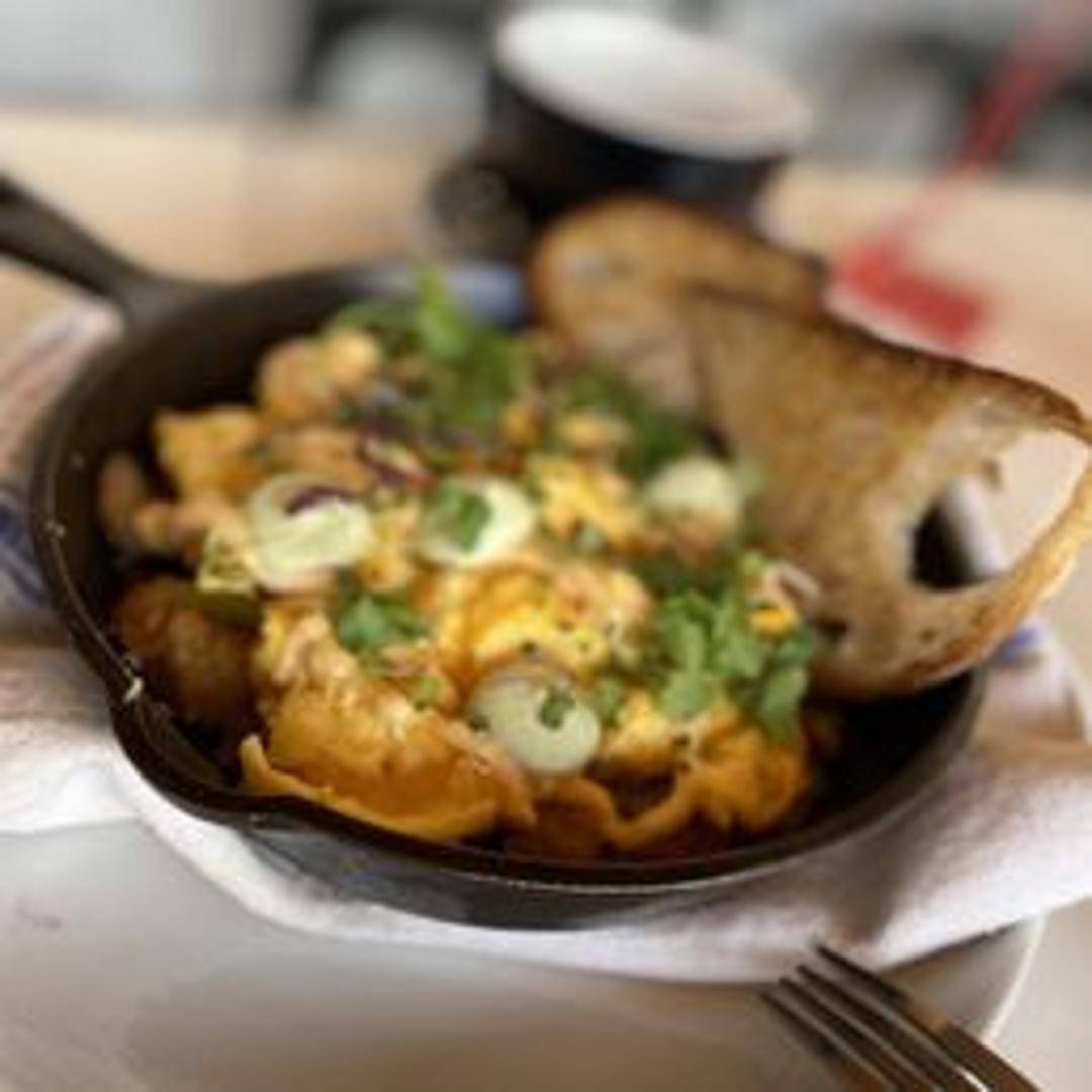 A hearty breakfast served in a skillet with eggs, potatoes, cheese, and your choice of meat and vegetables. Topped with your choice of sauce.