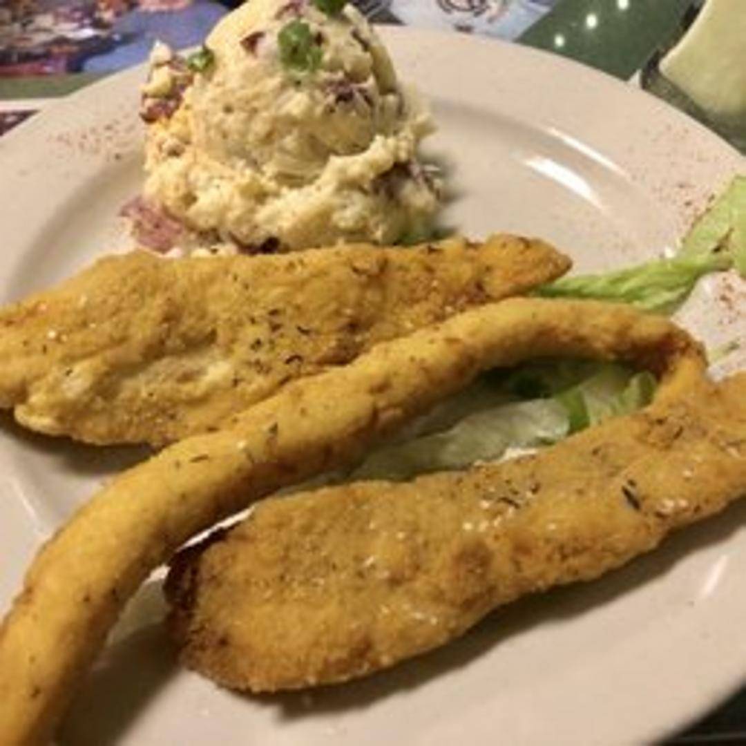 Crispy, golden-fried catfish filet served hot. Prepared with a traditional Southern-style breading for a flavorful and satisfying meal. Available as a single filet or as part of a platter.