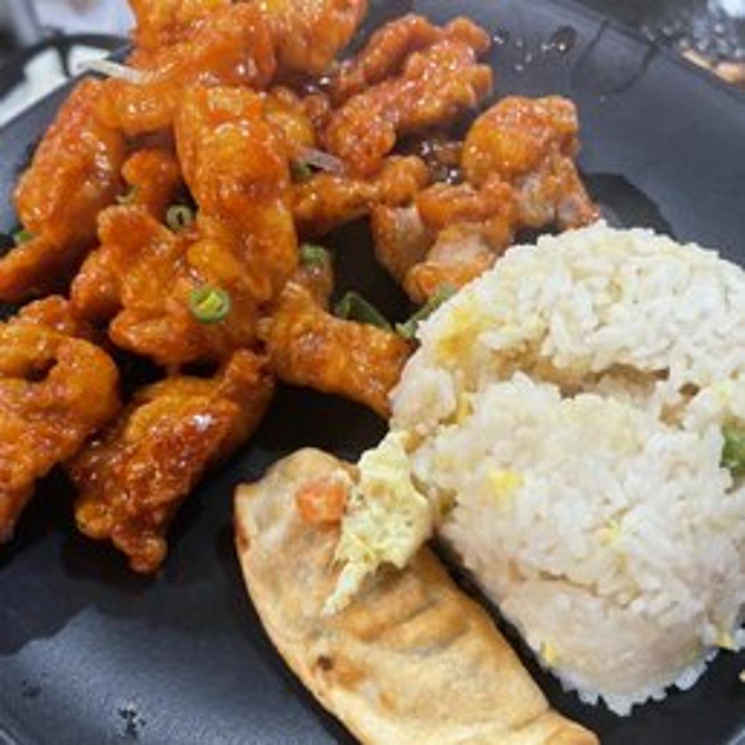 Crispy fried chicken pieces coated in a tangy and sweet orange-flavored sauce. Served with steamed white rice.